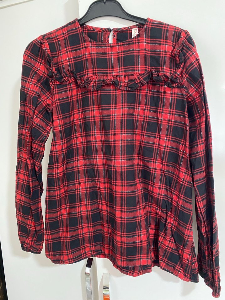 Kırmızı kareli, uzun kollu ve fırfırlı detaylı kadın bluz. Salaş kesimi ve yuvarlak yaka ile rahat bir görünüm sunar.