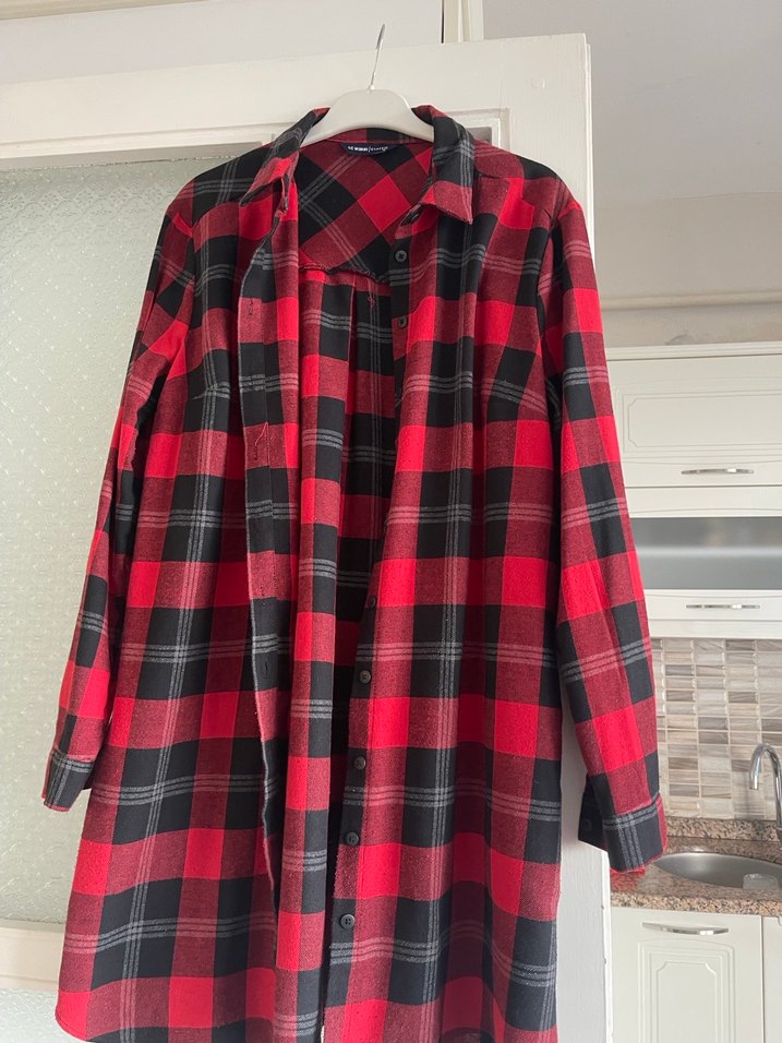 Kırmızı kareli, düğmeli, uzun kollu, salaş kesim midi uzunlukta gömlek. Sentetik kumaştan, rahat ve günlük kullanıma uygun.