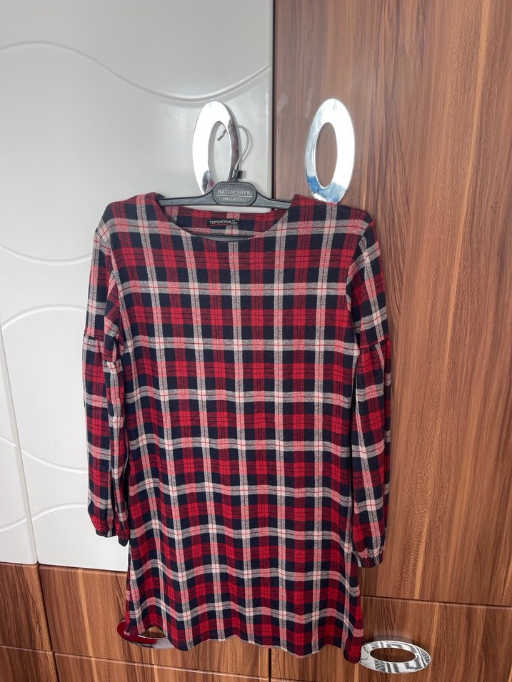 Koyu kırmızı kareli, uzun kollu, yuvarlak yakalı ve salaş kesim kadın gömlek. Düğmeli ve midi boyda, günlük kullanıma uygun sentetik kumaştan yapılmıştır.