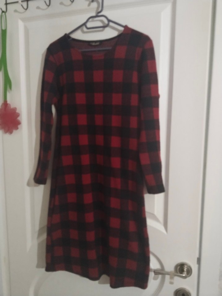 Kırmızı-siyah kareli, uzun kollu, midi boy, rahat kesim örme elbise. Yumuşak ve sıcak kumaştan, günlük kullanım için uygun.