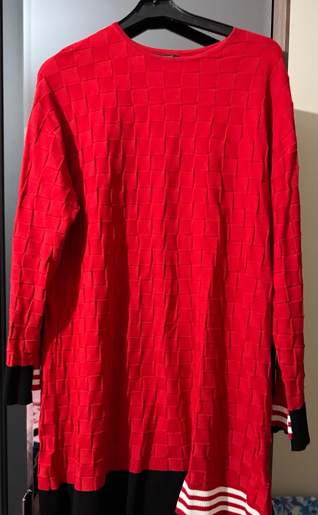 Renkli kırmızı kareli triko elbise, bol kesim ve uzun kollu. Bisiklet yaka, siyah manşetlerde beyaz çizgilerle sokak tarzı için uygun.