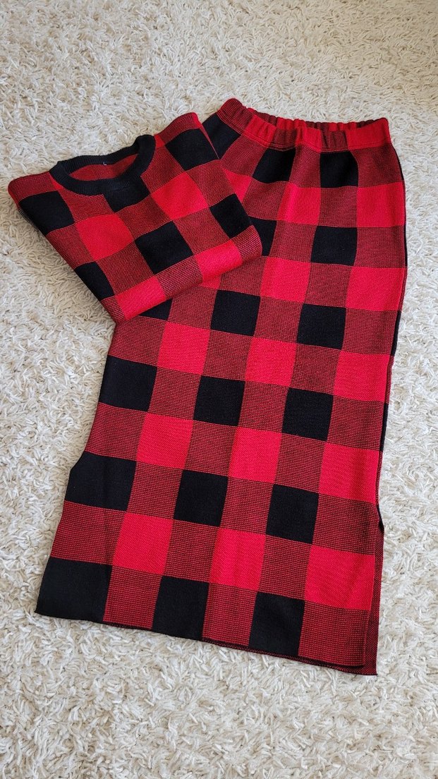 Kırmızı siyah kareli, uzun kollu ve kayık yaka triko elbise. Rahat kesimli, yumuşak ve sıcak kumaştan üretilmiştir.