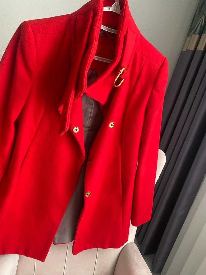Kırmızı kaşe kaban, yüksek yakası ve tokalı detayları ile şık ve sıcak tutar.