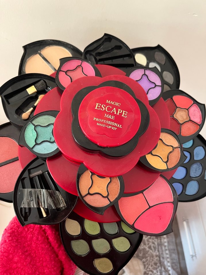 Koyu kırmızı renkte, katmanlı bölmelere sahip makyaj seti yeni gibi sadece fırçaları kullanıldı .