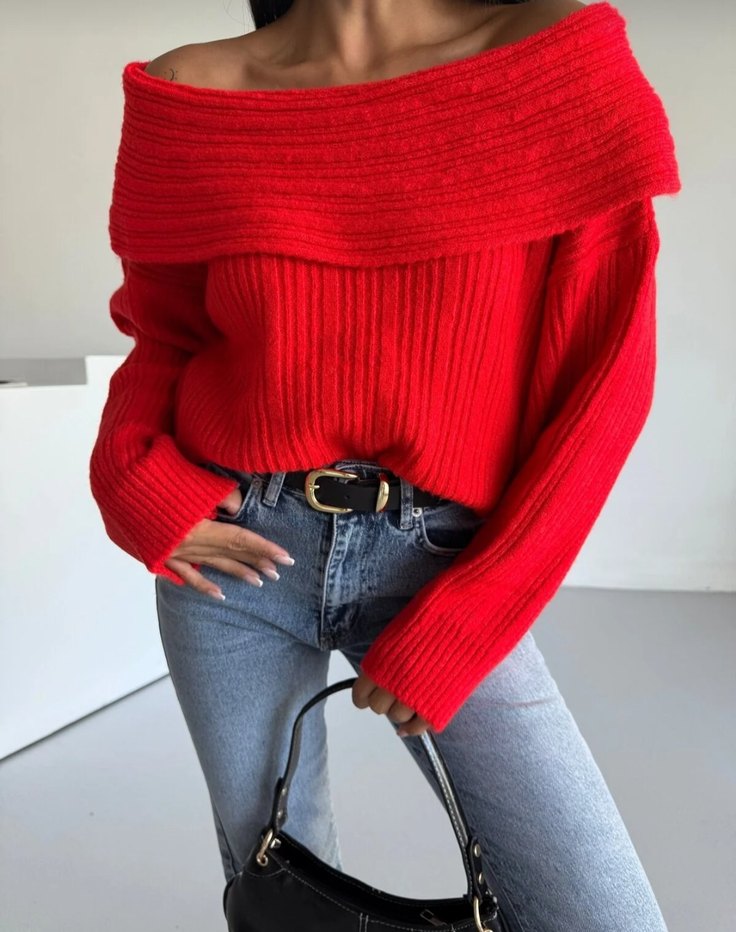 Kayık yaka ve bol kesimli kırmızı örgü kadın kazak, günlük sokak stili için uygundur. Normal uzunlukta, rahat ve sıcak dokusu vardır.6 renk mevcuttur.