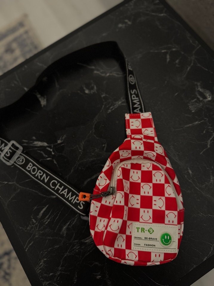 Kırmızı renkte, kayışlı ve gülen yüz desenli baskılı kadın çapraz çanta. Sentetik kumaştan, rock punk tarzına uygun günlük kullanıma ideal. Üzerinde TR-9 etiketi bulunur.