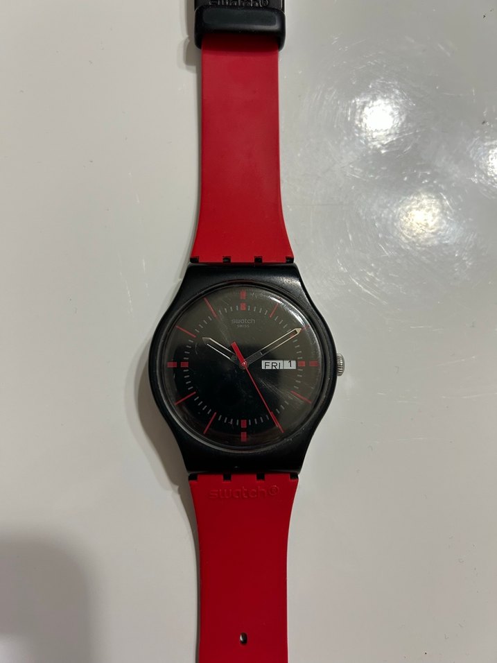 Koyu kadranlı, kırmızı detaylı ve tokalı kırmızı kayışa sahip erkek kol saati. Minimalist tasarımda, gün ve tarih göstergeli. ⌚
