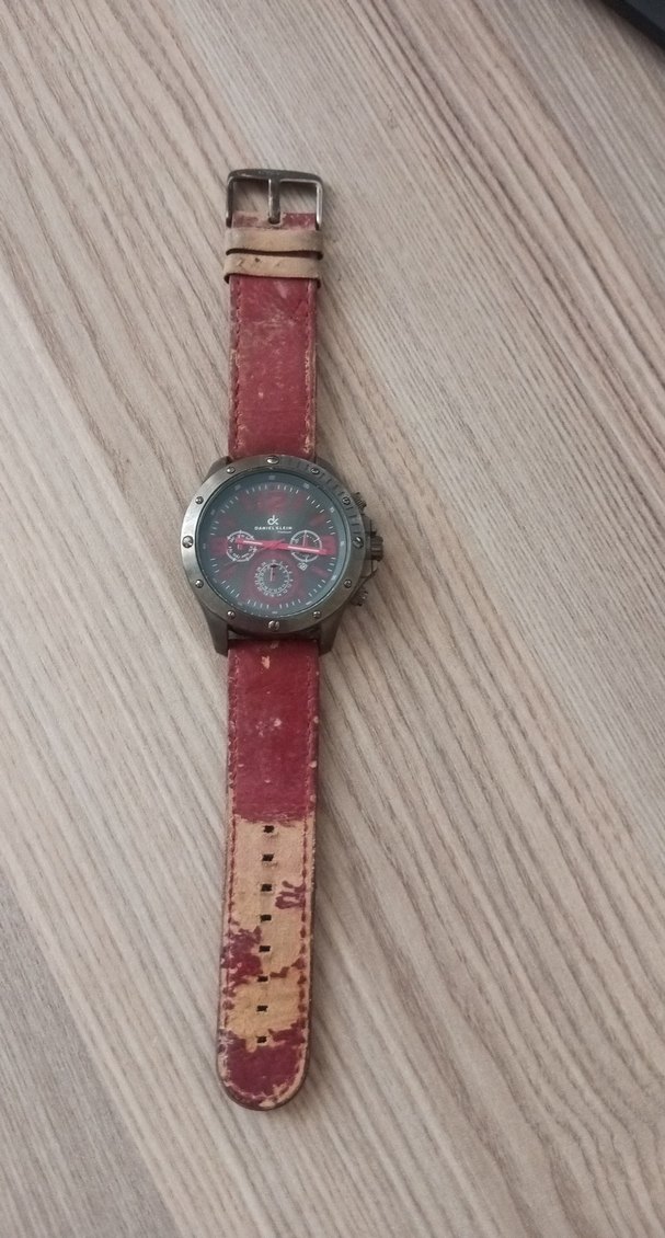 Gri kadran ve kırmızı detaylara sahip, aşınmış kırmızı deri kayışlı erkek saati, grunge punk tarzını yansıtıyor. ⌚