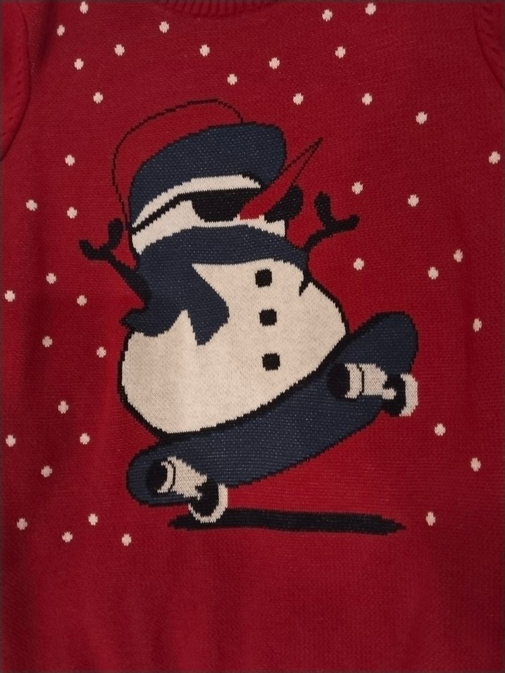 Koyu kırmızı renkte, kaykay yapan kardan adam figürlü Beyaz kar taneleri deseniyle süslenmiştir. ❄️neredeyse hiç kullanılmadı sorunsuz kış ve yeni yıl temalı kazak %100 pamuk