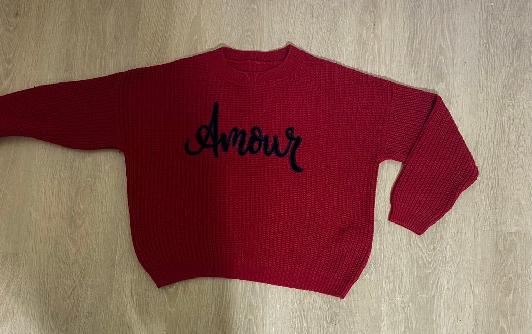 Kırmızı renkli, uzun kollu, yuvarlak yaka nakışlı triko kazak. Bol kesim ve normal boy ile rahat ve şık bir günlük kombin sağlar.