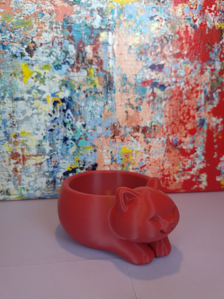 Pürüzsüz malzemeden yapılmış renkli kırmızı kedi figürlü saksı - kap, küçük bitkiler için uygun.