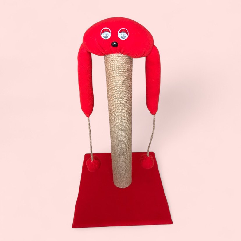 Kırmızı kedi tırmalama direği, oyuncaklı peluş üst kısmı ile kediler için eğlenceli bir oyun ve tırmalama alanı sağlar.