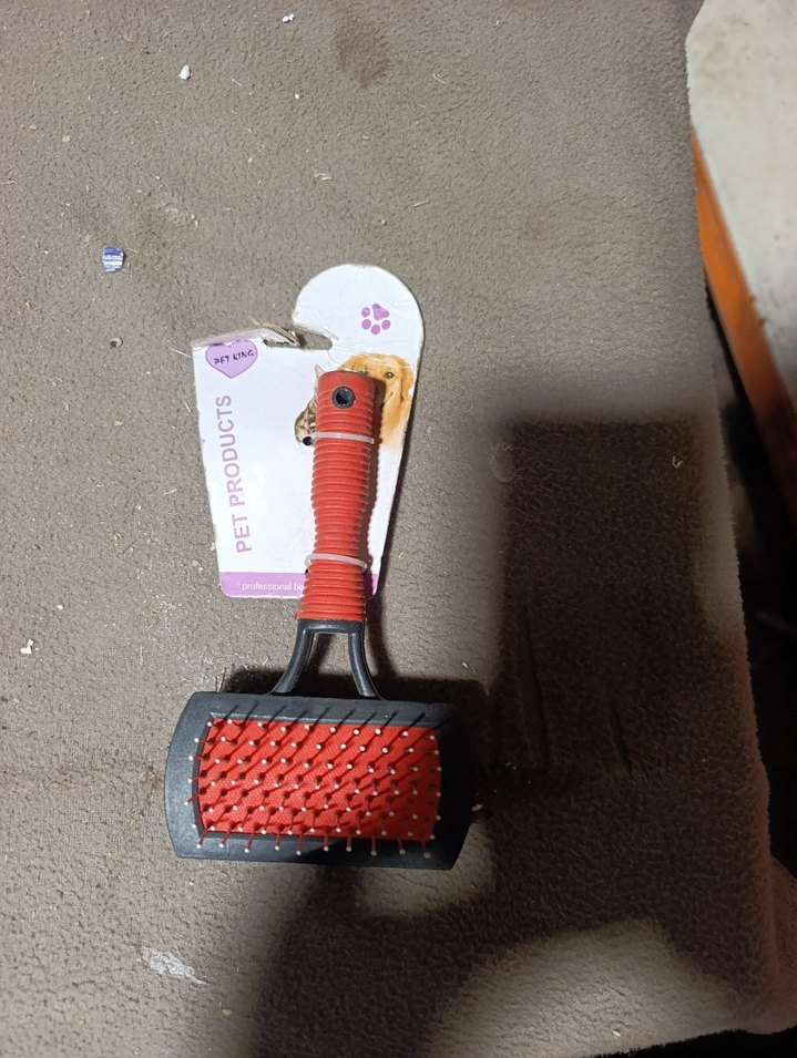 Kırmızı saplı ve ince metal kıllara sahip kedi tüy fırçası, tüyleri ve kiri temizlemeye yardımcı olur.