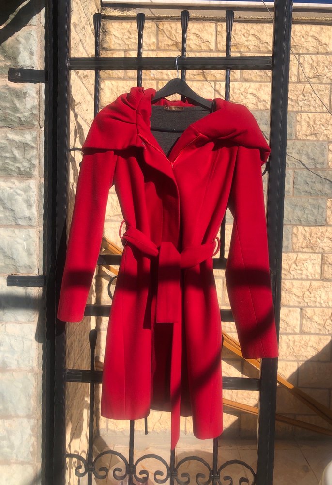 Kırmızı kadın kaban, geniş yakalı ve kemerli olup yumuşak ve sıcak kumaştan üretilmiştir. Serin havalar için uygundur.