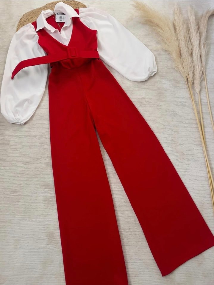 Kırmızı Kemerli Kadın Tulum