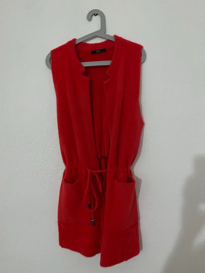 Kemerli bel, V yaka ve iki cep detaylı kırmızı, yumuşak ve sıcak kumaştan sleeveless yelek. Günlük rahat