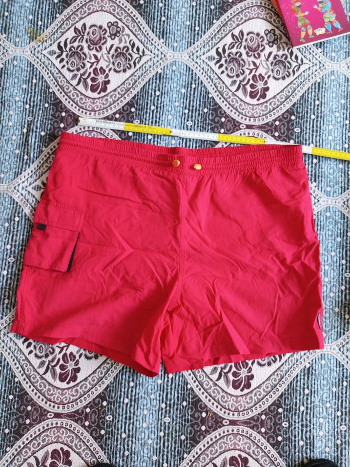 Kırmızı renkli, kemerli ve rahat kesimli mini erkek deniz şortu. Sentetik kumaştan üretilmiş, plaj ve günlük sokak stiline uygun.