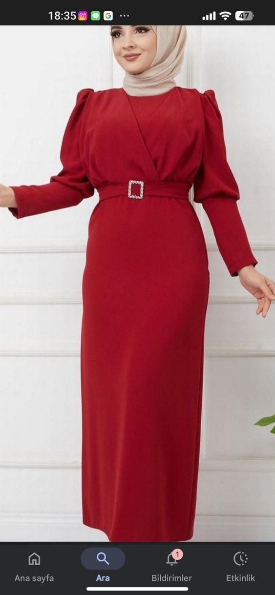 Parlak kırmızı renkte, V yakalı ve uzun kollu, kemerli klasik ve modern kesime sahip uzun elbise. Ofis kullanımı için uygundur. sadece 1 2 defa giyildi hiç sorunu yok sadece kemerini kaybettim