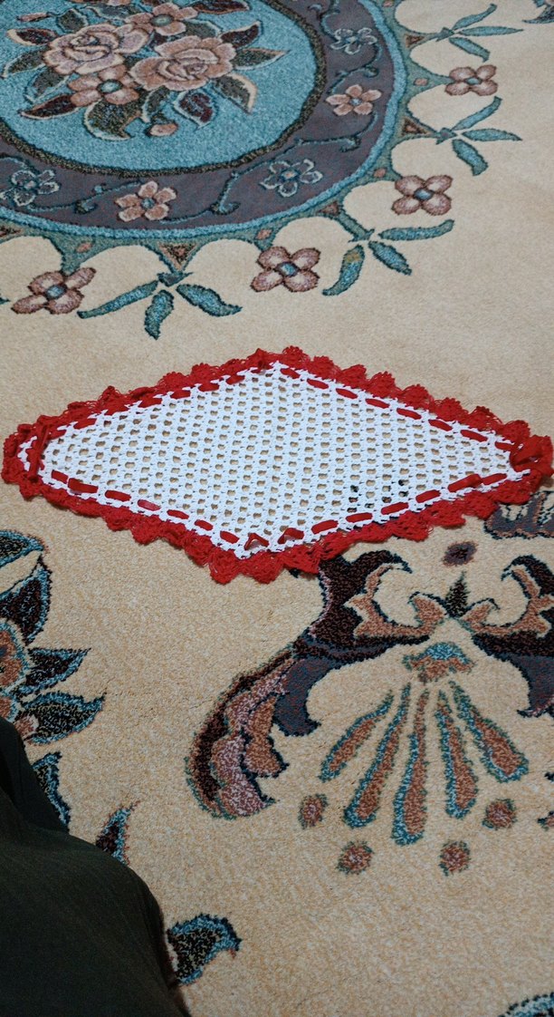 Kırmızı kenarlı beyaz el örgüsü motif, geleneksel tekniklerle hazırlanmıştır. Her mekâna klasik bir dokunuş katar. tepsi örtüsü