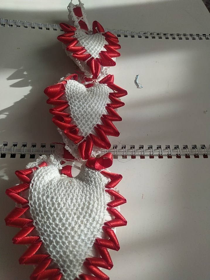 Kırmızı saten kenarlarla çevrili beyaz örgü kalplerden oluşan dekoratif el işi süs. ❤️