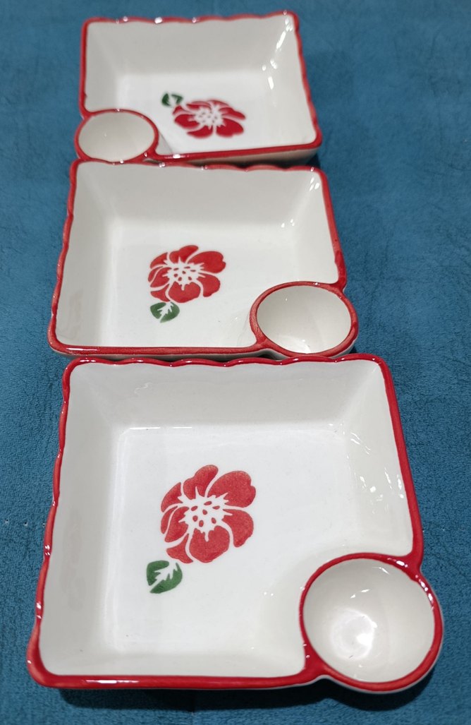 Koyu kırmızı kenarlara ve çiçek desenine sahip kare porselen tabak seti, her tabakta küçük yuvarlak bölme bulunur. ️13cm ebatlarında