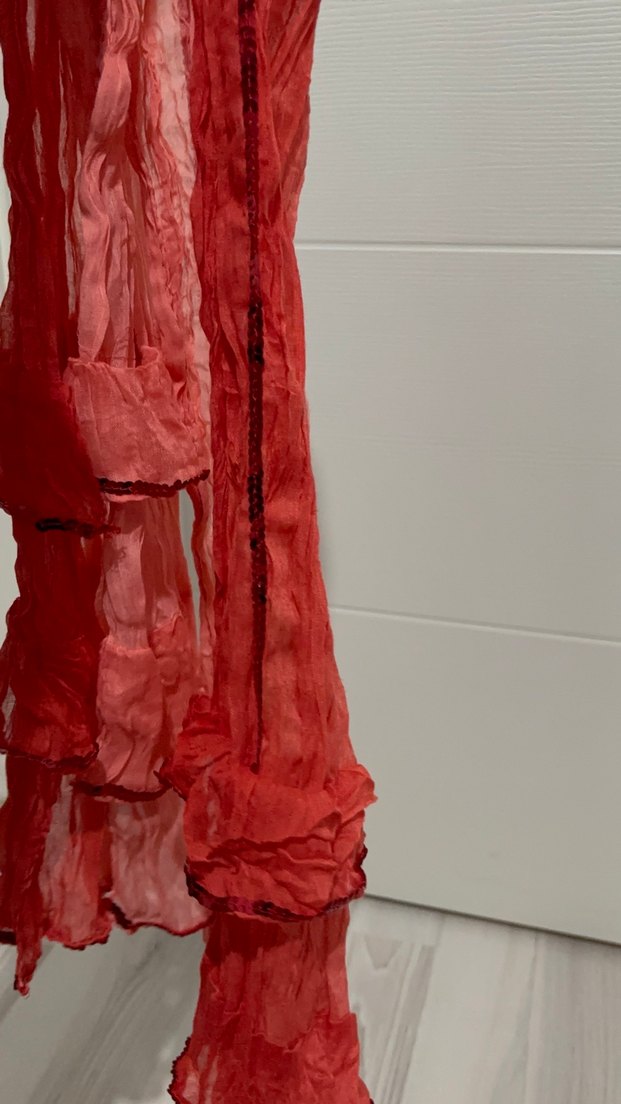 Keten kumaştan, koyu kırmızı renkte, bohem ve avangart tarzda, drapeli kadın şalı.