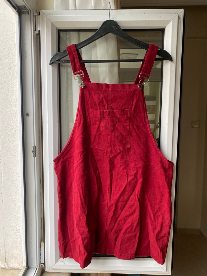 Parlak kırmızı keten kumaştan, bol kesim kısa tulum. Tokalı askıları ve yüksek yakası ile gündelik kullanıma uygun. İspanyadan alındı. S-m beden uyumlu