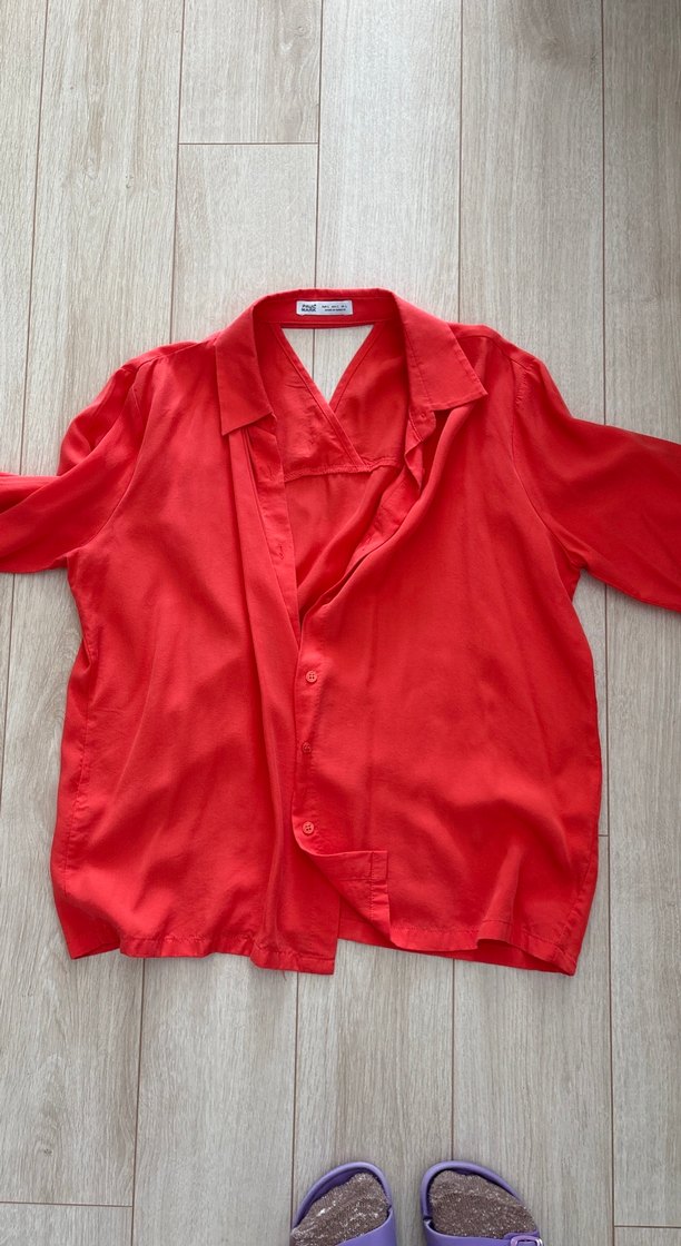 Parlak kırmızı keten kumaştan, düğmeli, kısa kollu, normal midi boyda, notched yaka detaylı bol kesim kadın gömleği.