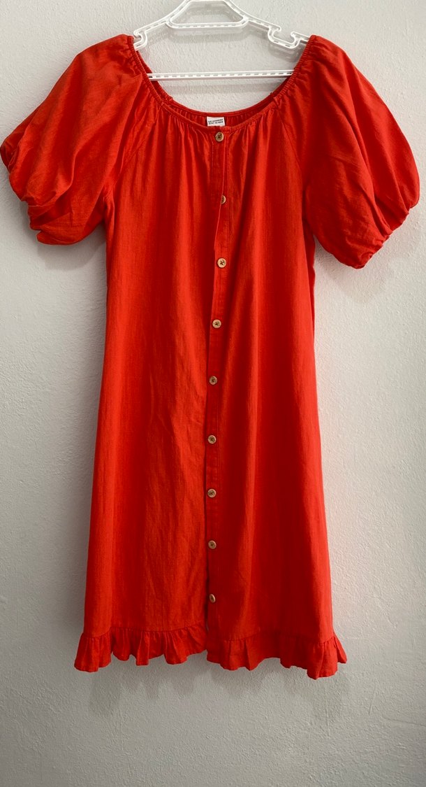 Kırmızı keten midi elbise, kısa balon kollu, tekne yaka ve düğmeli ön tasarıma sahiptir. Rahat ve bol kesimdir, bohem tarz için uygundur.