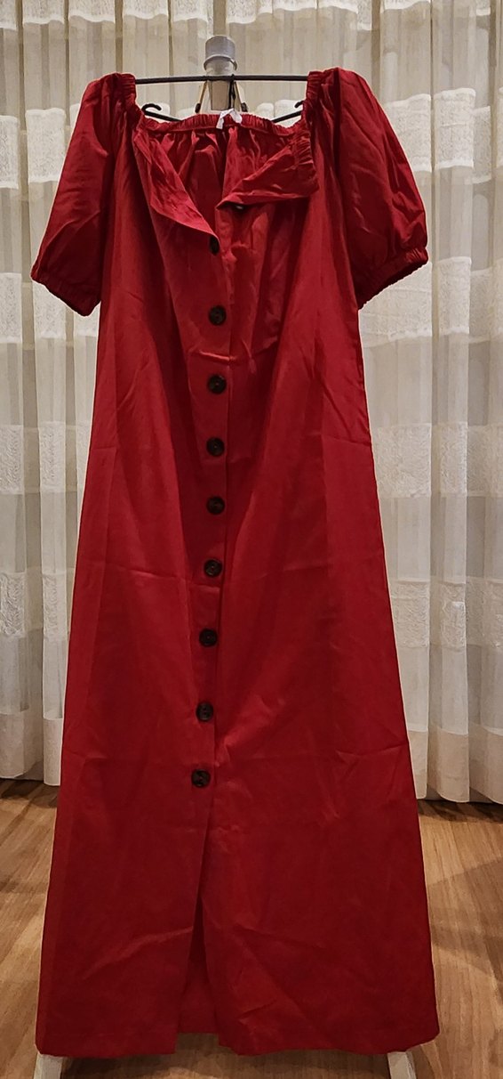 Kırmızı renk, uzun ve bol kesim kadın elbisesi. Kısa kollu, vintage bohem tarzda, düğmeli ön tasarıma sahiptir.