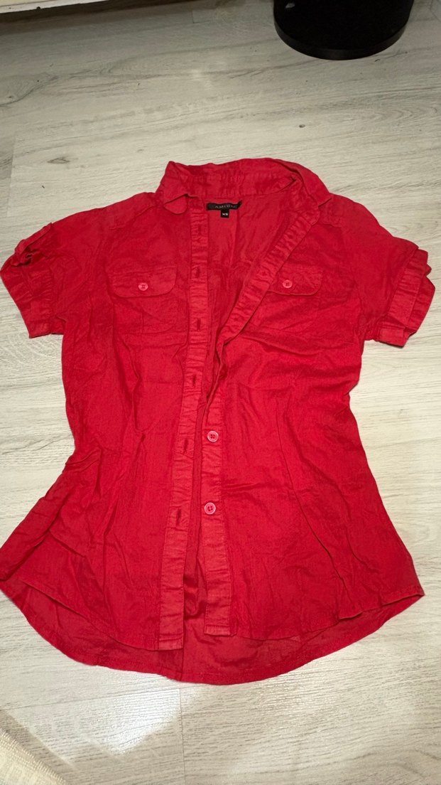 Keten kumaştan, kısa kollu, düğmeli ve yakalı kırmızı gömlek. Normal midi boyda, günlük rahat sokak stili için uygun.