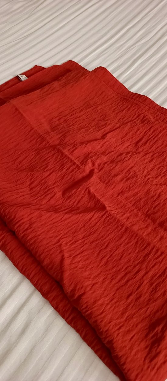 Parlak kırmızı keten kumaştan üretilmiş, drapeli tasarıma sahip kadın şalı. Rahat ve bohem tarz sunar.