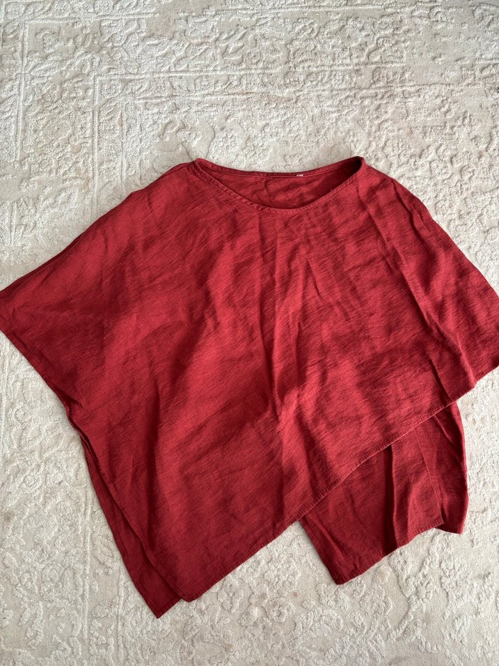 Keten kumaştan, kısa kollu, salaş kesimli, tek renk kırmızı bluz. Kayık yaka ve drapeli tasarımıyla rahat ve bohem tarz sunar. Etiketini kesmiştim M-L rahat olur kesimi bol
