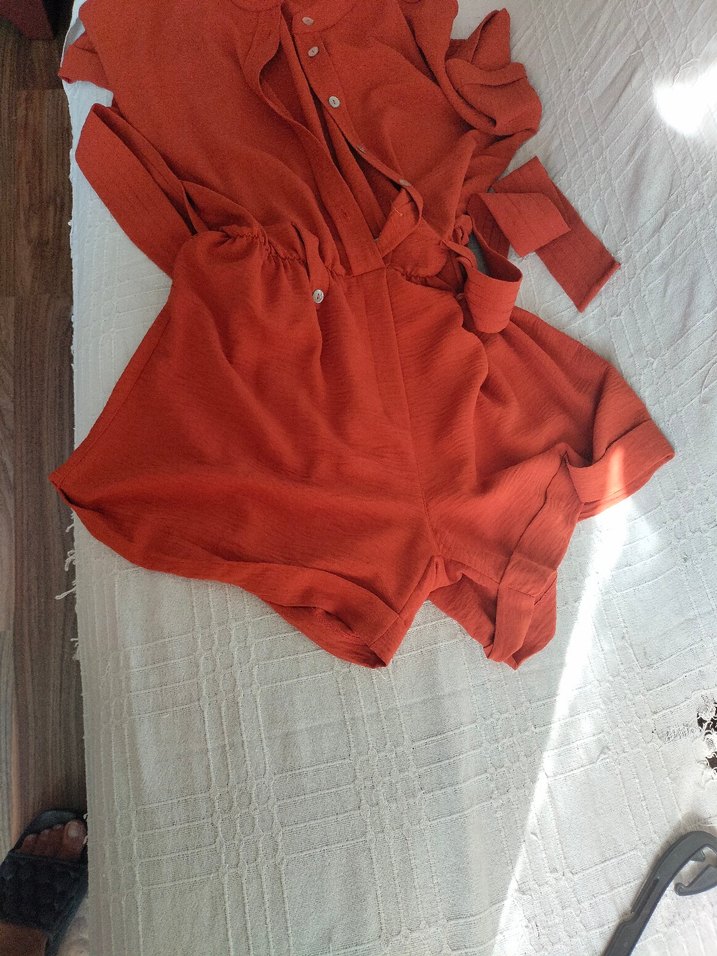 Kırmızı keten mini tulum, bol kesim, düğmeli ve Yuvarlak yakalı, bohem tarzda, günlük kullanıma uygun. yarım kollu beli kemerli içten lastikli