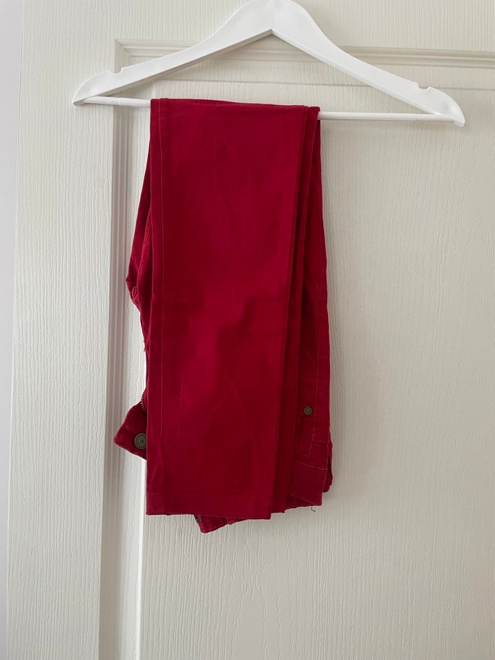 Kırmızı, parlak ve desen içermeyen kız çocuk pantolonu,regular fit ve ipeksi dokuda, günlük kullanıma uygun.
