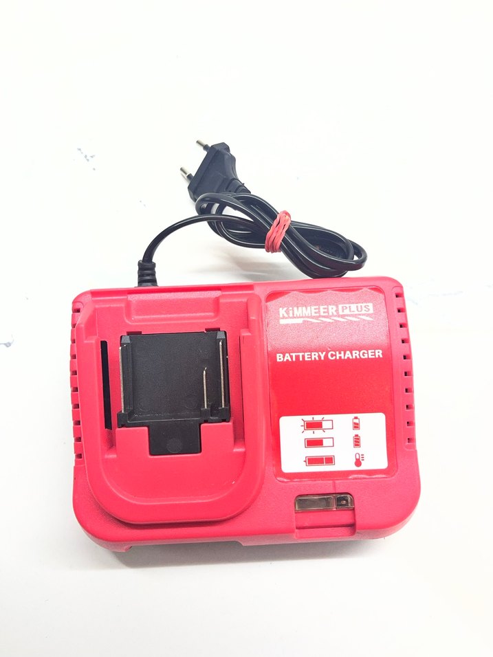 Kırmızı KimmeerPlus pil şarj cihazı, kompakt tasarıma ve kolay kullanım için güç fişine sahiptir. Şarj göstergeleri bulunur.