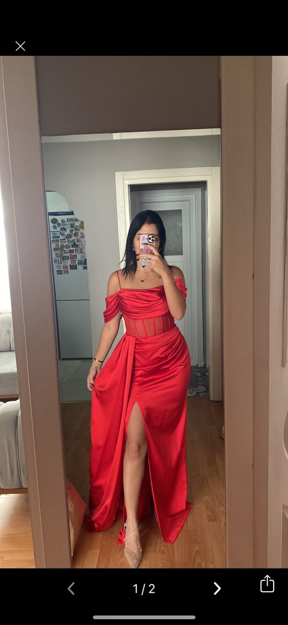 Parlak kırmızı, drapeli ve askılı detaylara sahip, vücuda oturan uzun elbise. Romantik akşamlar için uygundur, modern tarzda ve yırtmaçlıdır. Kına için kullanılır ve bir kere giyindim