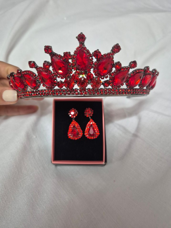 Kırmızı cam taşlarla süslenmiş taç ve uyumlu küpelerden oluşan klasik ve gösterişli bir set. Özel günler için uygundur.