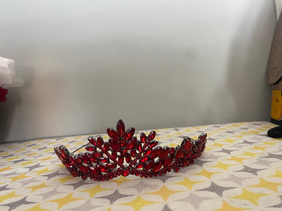 Koyu kırmızı cam taşlarla süslenmiş, klasik ve parlak tasarıma sahip kadın saç aksesuarı. Glamour ile karşı kültür stilini birleştirir.