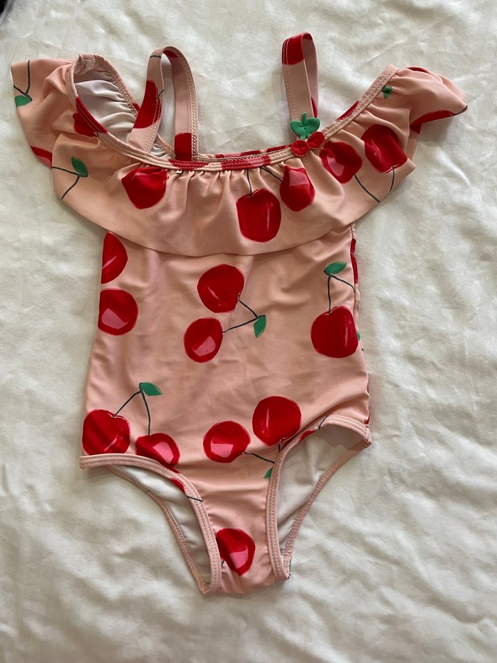 Kırmızı kiraz desenli, askılı ve fırfırlı pembe kız mayo. Canlı renklerle plajda kullanılabilir. 24-36 ama 3-4 yasa kadar mınyon cocklar rahatlıkla kullanabılır.