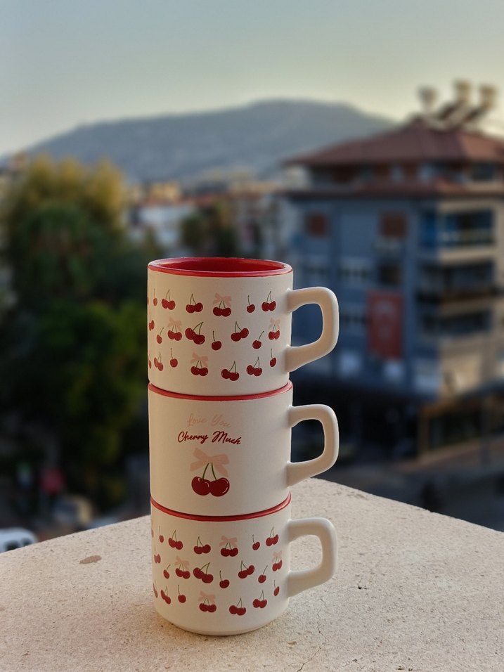 Pastel kırmızı kiraz desenli beyaz seramik kupalar. Kulplu ve pürüzsüz yüzeylidir, sıcak içecekler için uygundur.