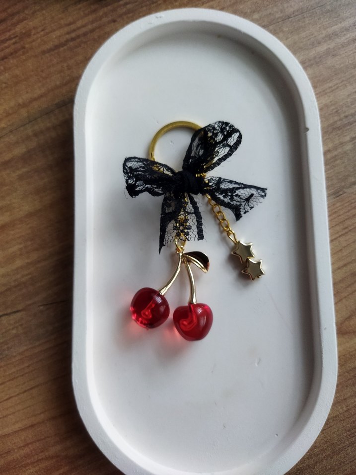 lütfen ilan actiriniz.Kadın anahtarlık, siyah dantel fiyonk ve kırmızı kiraz detayları ile altın halka ve yıldız süslemelerine sahiptir. Cesur Parisli gotik tarzını yansıtır.marka temsilidir #charm#kiraz#anahtarlik#cantasusu