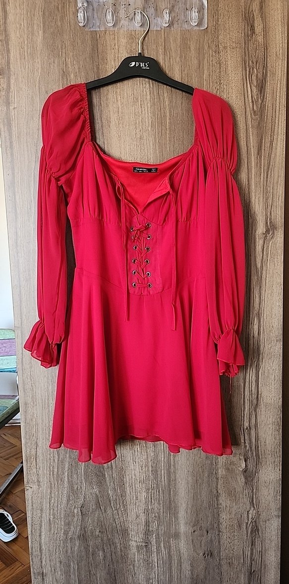 Kırmızı midi boy, bol kesim elbise, uzun kollu ve tekne yakalı. Düğme detaylı, ipeksi dokulu, romantik akşamlar için uygun. m l uyumlu