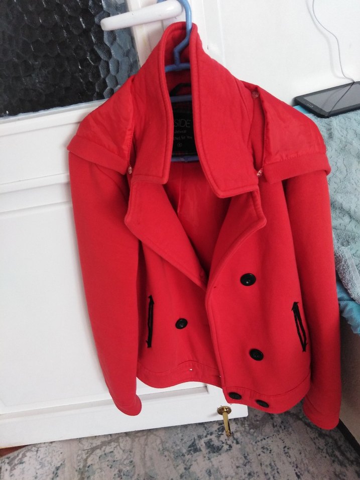 Kırmızı renkte, çift düğmeli ve geniş yakalı kaban. Siyah detaylı iki ön cepli.