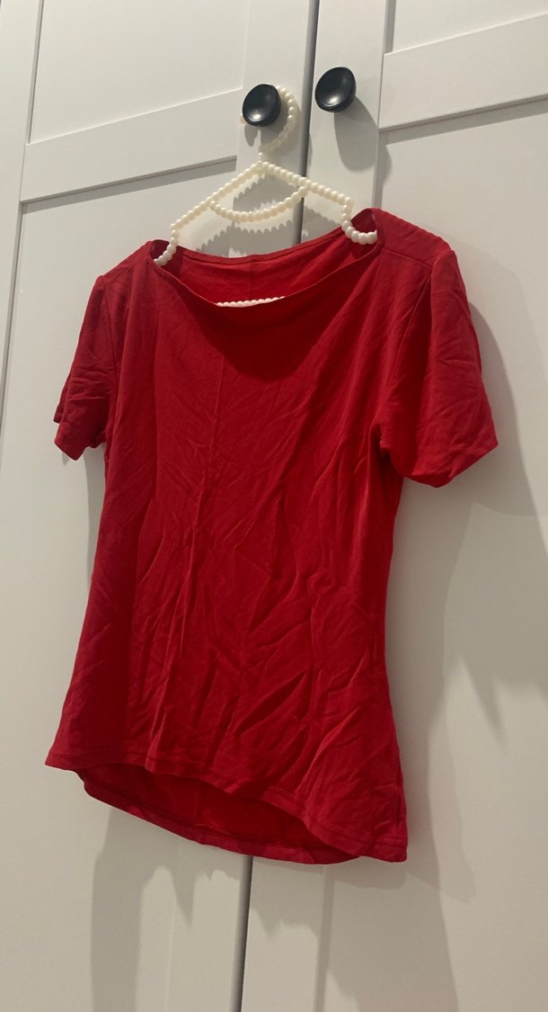 Kırmızı, kısa kollu, kayık yaka ,. Parlak dokusu günlük kullanım için sade ve şık bir görünüm sunar.