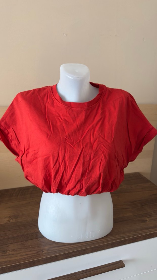 Bu kırmızı crop top, yuvarlak yakalı ve kısa kolludur. Yumuşak keten kumaştan, drapeli ve parlak görünümlüdür, günlük kullanım için uygundur.