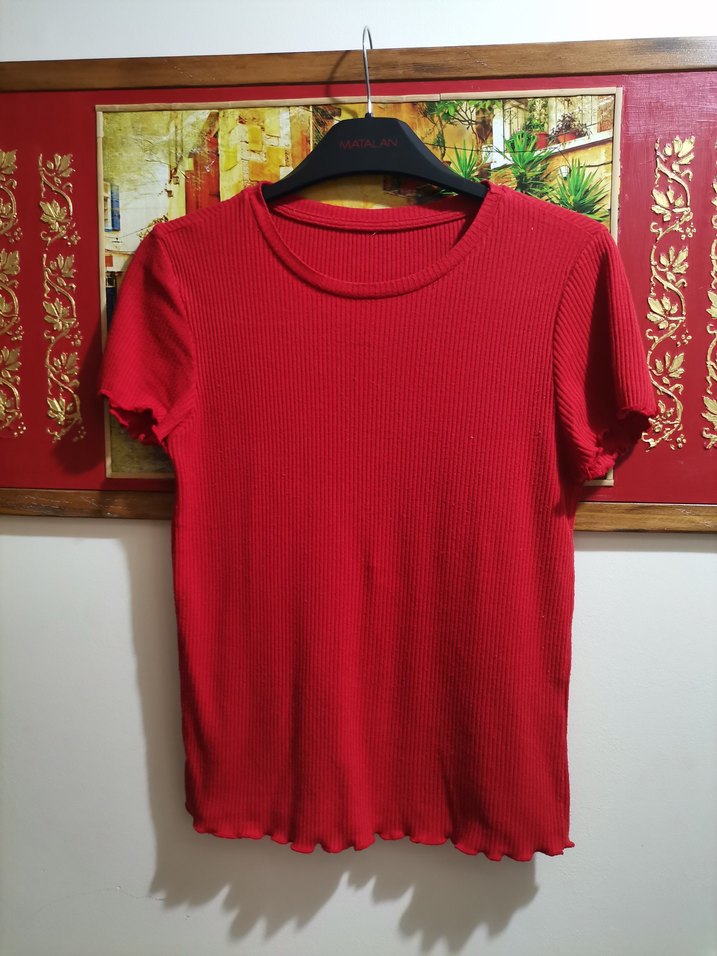 Kırmızı kısa kollu, likralı kadın tişörtü. günlük kullanım için rahat bir sokak stili sunar. Hafif topaklanma mevcut sadece