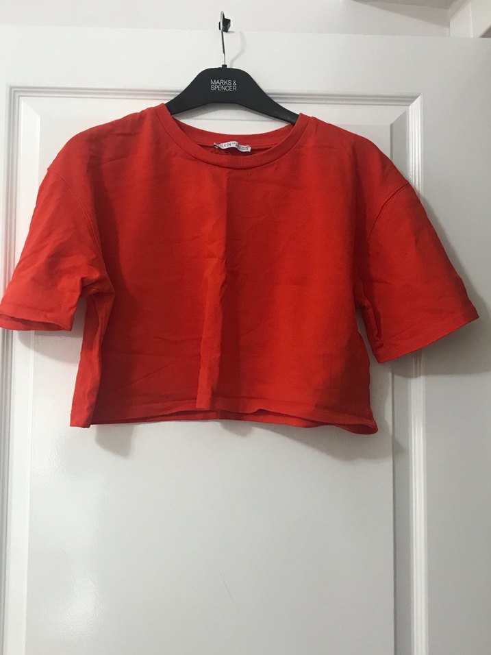 Kadınlar için keten kumaştan, kısa kollu ve yuvarlak yakalı, bol kesim kırmızı tişört. Canlı renkli, kısa boyu ve sade tasarımı günlük kullanıma uygundur.