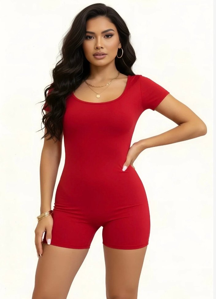 Kadınlar için parlak kırmızı renkte, kısa kollu ve yuvarlak yakalı, satenimsi kumaştan yapılmış, günlük sokak stili için uygun, vücuda oturan kısa tulum. ✨ L - M beden mevcuttur