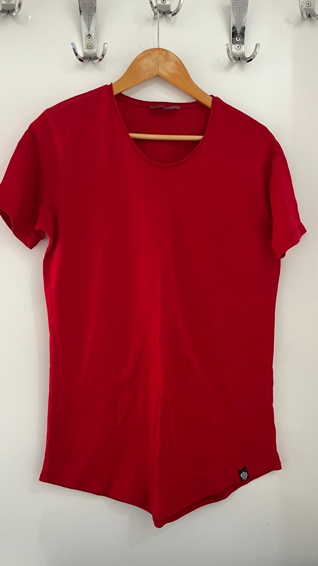 Bu kırmızı, kısa kollu kadın tişörtü, crew yaka ve vücuda oturan kesime sahiptir. İpeksi dokusu günlük kullanım için uygundur ve minimalist, sokak stili ile uyumludur.